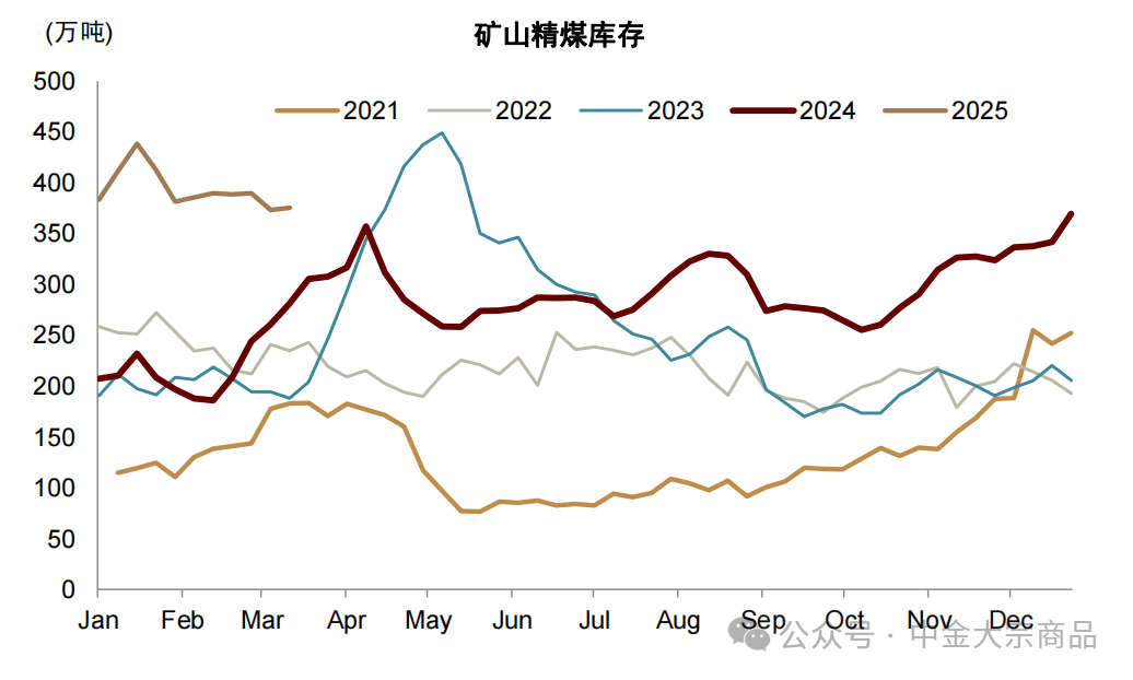 焦煤方面,产业链的高库存对蒙煤供应也形成了反向压制,截至3月14日,今年累计通关量同比下滑了3.7%。但全年来看,蒙煤的新增供应压力仍比较大,作为重要的出口商品,蒙古政府鼓励开发和出口国内煤炭资源,随着边境港口运力不断完善,铁路、公路和 AGV 等交通基础设施的建设与投入将进一步提升运输增量。我们预计蒙煤的供应可能走以价换量的逻辑,2025年蒙古焦煤进口量或将进一步增长至6000万吨,内煤产量同时维持高位,国内焦煤市场供过于求压力可能会进一步加剧。