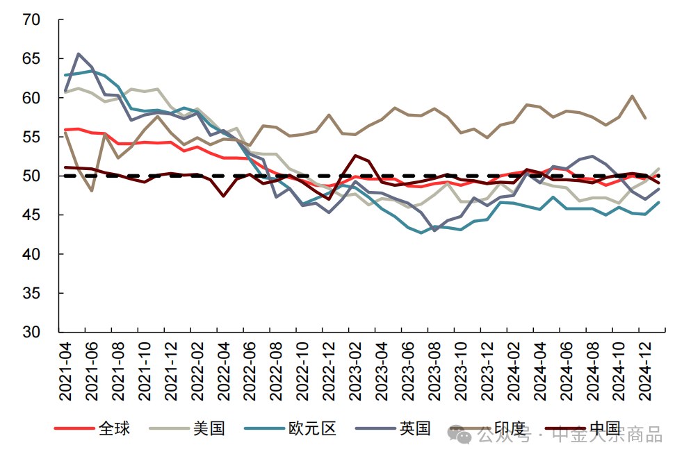 不过,我们认为美国经济若能实现适度降温对有色金属定价可能并非坏事,美国的高通胀和高利率若能得到缓解可以通过美元流动性条件的改善以支撑铜价。而利率的降低与增长型政策的出台也有助于制造业周期的复苏,叠加欧洲等地的财政加码预期,我们认为海外制造业可能仍在上升通道。近来全球PMI呈现修复态势。2月全球制造业PMI环比上升0.5至50.6,连续两个月位于荣枯线上方。其中,欧元区环比上升1.0至47.6。我们认为,随着以德国为代表的欧洲国家开始加大对于国防和基建的开支力度,欧洲制造业景气度或将进一步上行。美国2月ISM制造业环比下降0.6至50.3,但也处在扩张区间。另外,相较于发达国家,新兴市场修复趋势则更为强劲,环比上升0.4至51.2。