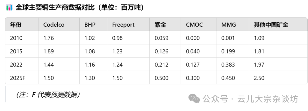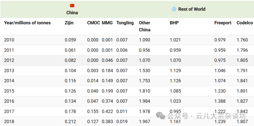 紫金矿业(Zijin):从 2010 年的 5.9 万吨 增长到 2023 年的 80 万吨,成为中国最大的铜生产商。