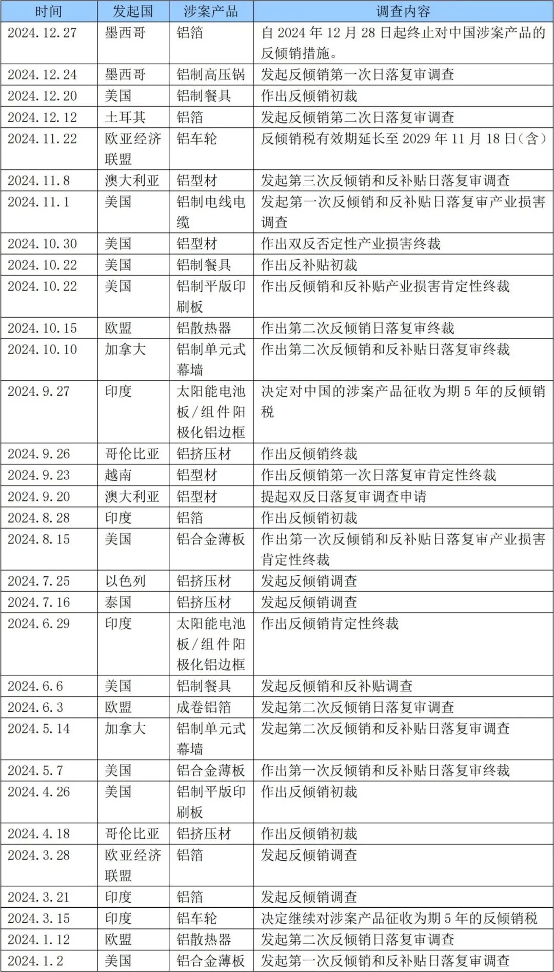 表2 2024年铝材、铝制品及铝车轮遭遇的贸易调查案件