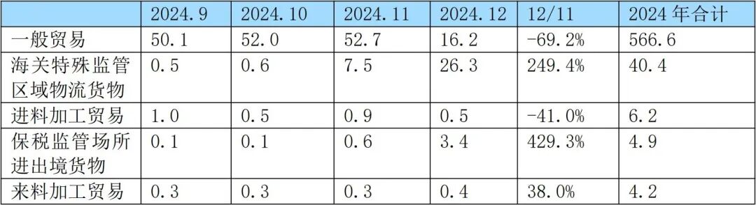 受取消出口退税政策影响,我国铝材出口贸易方式也在发生转变。长期以来我国铝材出口以一般贸易方式为主,不同贸易方式的出口退税额计算方式有所不同。一般贸易对铝锭和加工费整体进行出口退税,进料加工仅对加工费出口退税,来料加工不涉及出口退税。因此,取消退税后,12月一般贸易方式下出口环比下降69.2%;进料加工方式下出口环比下降41.0%;来料加工方式下出口环比增长38.0%。此外,由于企业将12月1日政策实施之前来不及向海外发货的部分产品放在保税区,使得“海关特殊监管区域物流货物”及“保税监管场所进出境货物”贸易方式下出口环比分别增长249.4%和429.3%。
