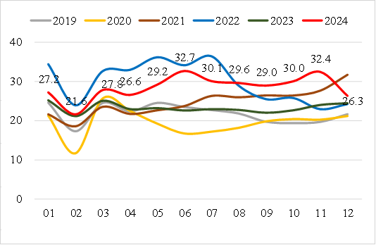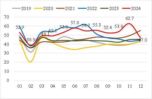 图2 2019-2024年中国铝材月度出口量(单位:万吨)