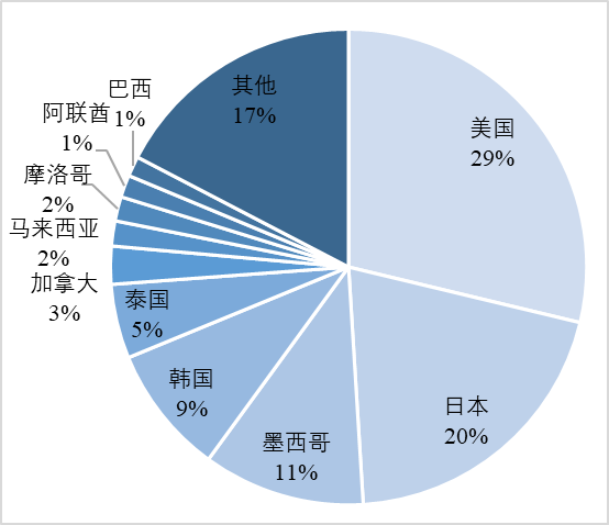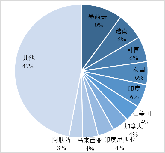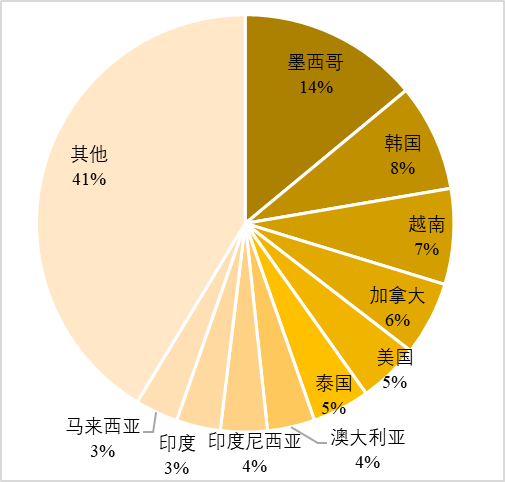 2024年,我国从40个国家和地区进口铝车轮,主要来自墨西哥、德国、日本。2019年开始墨西哥超过德国,成为我国铝车轮最大进口来源国,目前占总进口量的49.3%。