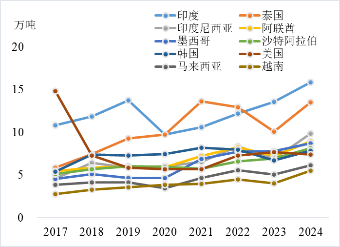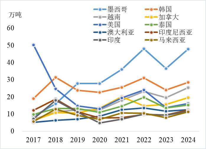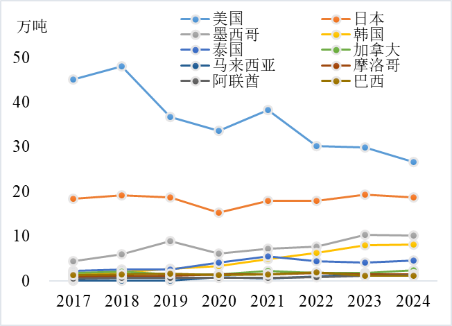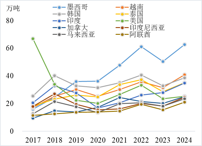 近年来我国铝车轮出口约占国内产量的40%,出口目的国较为稳定且集中度高,向美国和日本的出口约占总出口量的50%。美国一直是我国铝车轮最大出口目的国,受“232”“301”调查加征关税影响,对美出口量及出口占比持续降低。2024年向美国出口铝车轮26.6万吨,较上年下降10.9%,占中国出口总量的28.8%。与此同时,墨西哥、韩国、泰国等出口市场正在不断崛起。