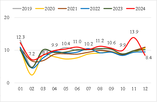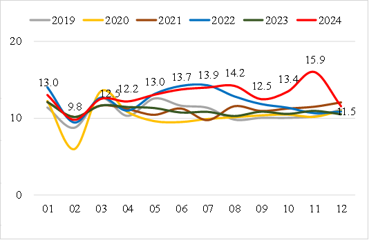 图11 2019-2024年中国铝制品月度出口量(单位:万吨)