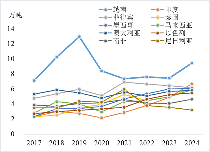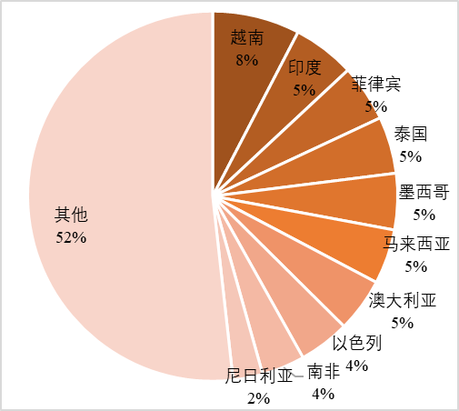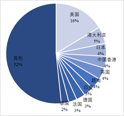 2024年,我国从全球72个国家和地区进口铝挤压材,主要来自越南、中国台湾、美国,自以上三个国家和地区的进口量占总量的68.5%。
