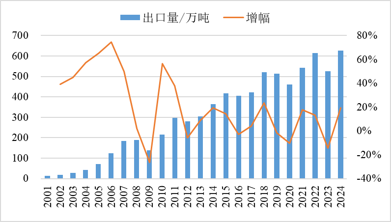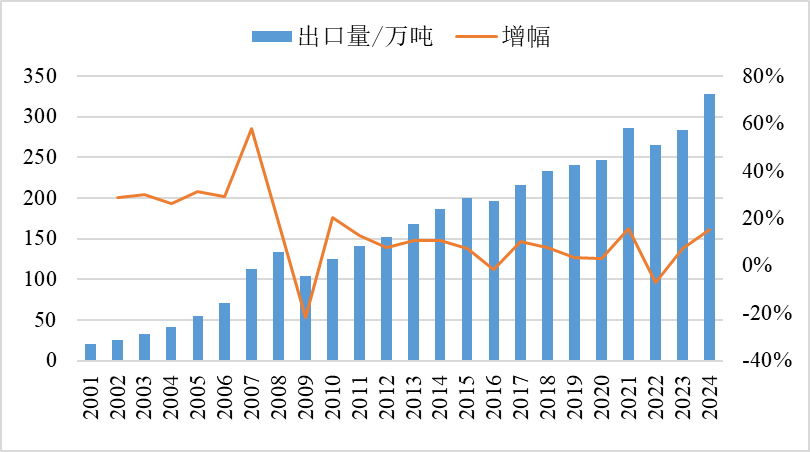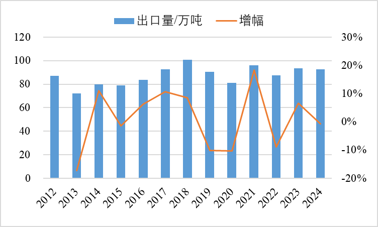 图13 2012-2024年中国铝车轮出口量及增幅(单位:万吨)