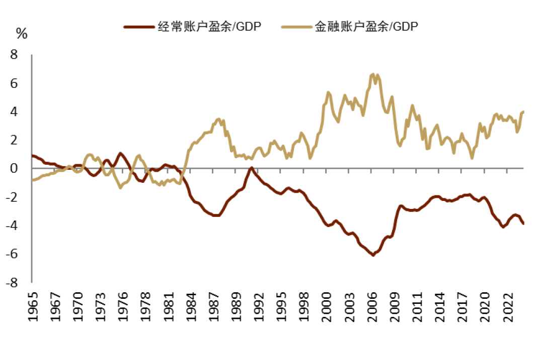 图表6:自1980年代开启全球化以来,美国经常账户赤字、金融账户盈余