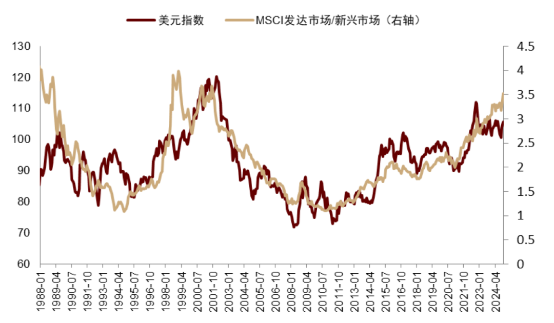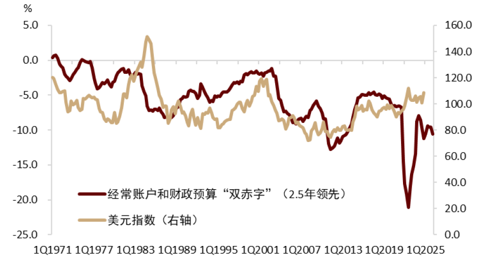 “里根大循环”本质是顺周期的,往往导致系统的失衡与汇率的调整。具体来讲,宽财政推动经济高增长和美元升值,往往带来贸易赤字的恶化,叠加财政赤字短期难以收敛,双赤字问题终将引发投资者关注甚至担忧。当美国双赤字超过某一阈值一定时间后,在某些催化剂下,往往触发美元开启长周期贬值(图表3。