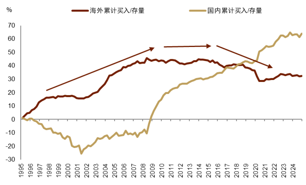第四,美股估值下行,风格转换。价值顺周期有望长期跑赢大盘成长,即多道指空纳指。首先,在美国名义GDP增速长期较高时期,美股及大盘成长估值往往数年趋势下行,同时价值顺周期往往跑赢大盘成长。可能的逻辑是,当名义增速长期较高时,市场倾向于增配顺着高名义增速盈利弹性大的风格或行业:金融、工业、材料、能源、消费等,而这些更多集中在道琼斯指数里。其次,特朗普重置资本结构、力推脱虚向实,可能利好更能代表产业资本的道琼斯、利空更能代表金融资本的纳斯达克。第三,在《宏观探市2月报:DeepSeek触发中美资产重估》中,我们指出DeepSeek冲击了过去两年美国的“AI叙事”,需要时间来消化之前美国AI科技公司过于乐观的盈利预期。第四,在实物资产超级周期下,全球资金在美股vs实物投资之间往往长期再平衡,因此美股尤其大盘成长估值趋势承压。最后但同等重要的是,美元体系松动,全球资金再平衡。自1980年至2024年,外资累计净买入美股2.3万亿美元,而美国国内资金仅4624亿美元,外资流入趋势在1990-2010年代全球化加速时期尤为陡峭。特别地,自ChatGPT诞生以来,外资是美股净买入的绝对主力,累计占比70.2%。这背后体现的是全球化时期外资对美元资产安全性和成长性的信任,而这一信任的基础正随着美国的全球收缩战略而出现裂痕,全球资金很可能将在美国vs非美之间再平衡。