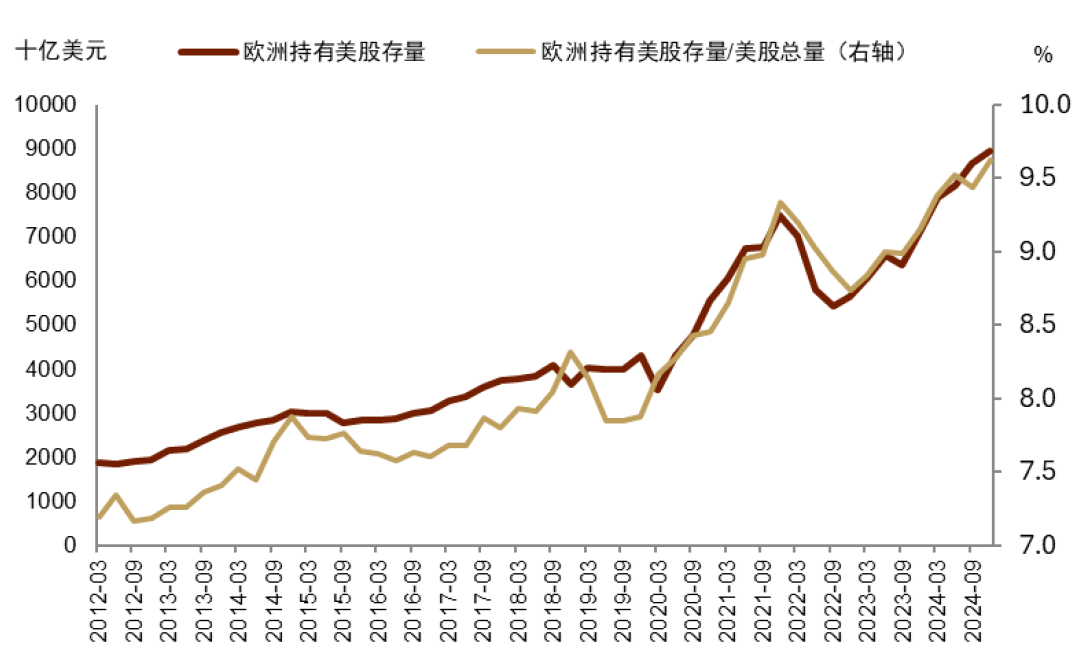 第五,看好欧洲股票。表面上,在欧洲再武装和德国大财政的背景下[7],欧元资产有望提振。根本上讲,在多极化和美元体系松动的背景下,我们预计过去长期流入美元资产的欧洲资金有望趋势回流欧洲(图表32),这将对美欧资产产生深远影响。