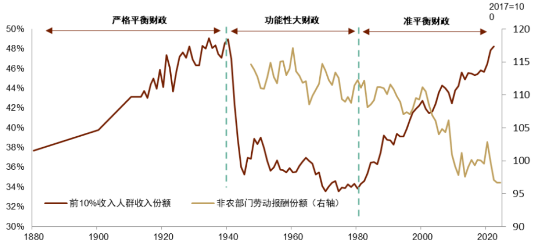拉长周期来看,自十九世纪末以来,美国基于收入和财富的不平等指数经历了“恶化-改善-恶化”三轮大周期的更迭,每轮四十年左右。背后对应了不同的财政理念:二战前严格平衡财政,二战到七十年代的功能性大财政,八十年代到疫情前的准平衡财政。