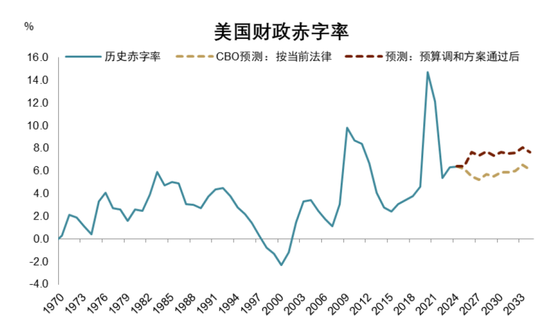 总量之外,政府支出结构也值得关注。疫情以来,美债利息负担大幅攀升,2024年升至8817亿美元,于二战后首次超过国防开支,CBO预计今年预计高达9523亿美元,恐超过第二大支出医疗保健Medicare,并直追第一大支出社会保障。根据“弗格森定律”[5] ,当帝国债务利息负担超过国防开支后,往往伴随地缘秩序的不稳定。因此,化债尤其压降美债利息负担将成为特朗普政府今明两年的重点议题。