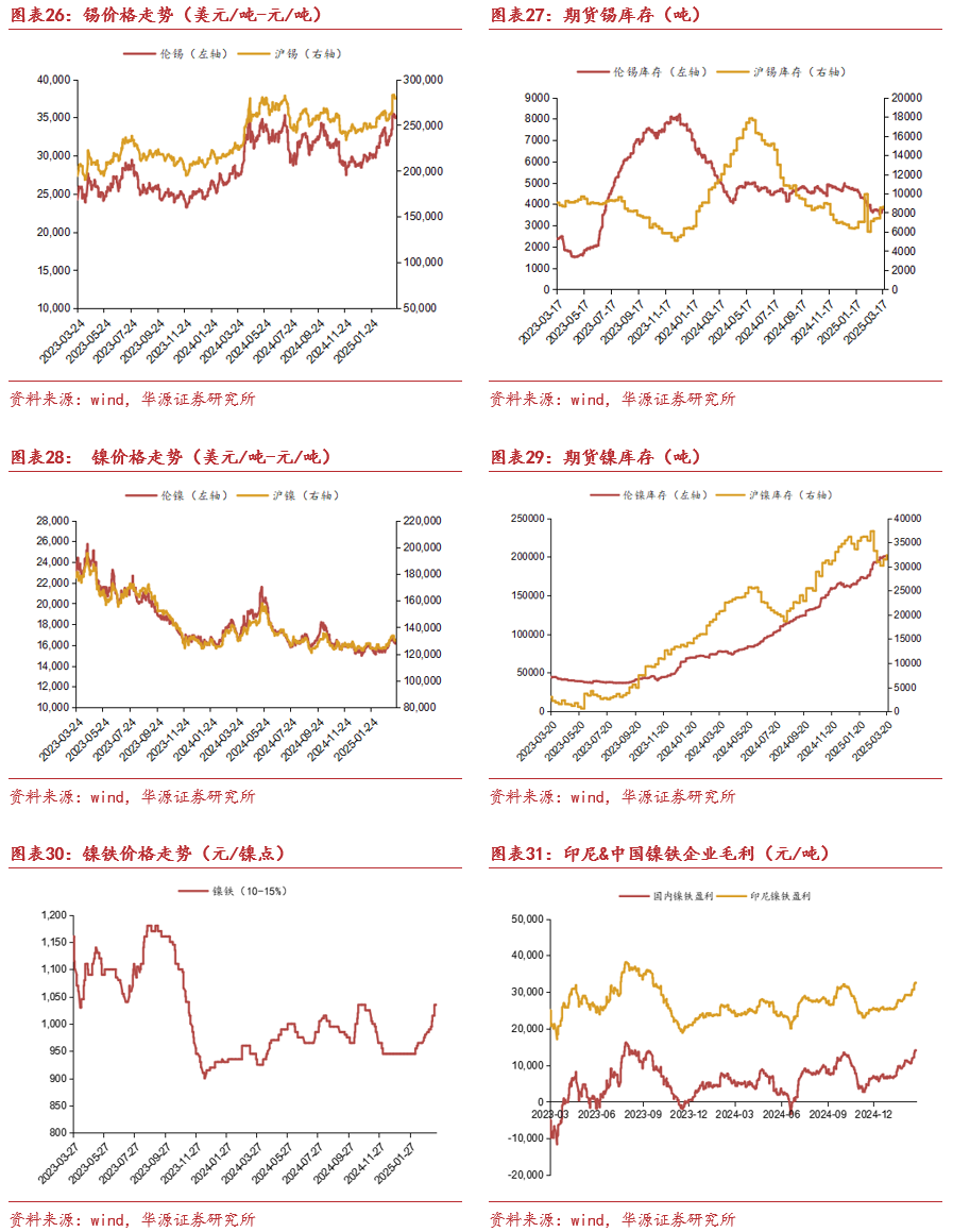 本周伦锡价格下跌1.70%,沪锡价格下跌1.38%;库存方面,伦锡库存上涨4.44%,沪锡库存上涨0.99%;本周伦镍价格下跌3.09%,沪镍价格下跌2.92%;伦镍库存上涨0.05%,沪镍库存上涨2.82%;镍铁价格上涨1.97%;国内镍铁企业盈利为14072元/吨,盈利扩大,印尼镍铁企业盈利上涨6.16%至32520元/吨。