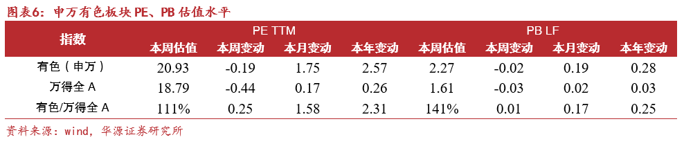 PE_TTM估值:本周申万有色板块PE_TTM为20.93倍,本周变动-0.19倍,同期万得全A PE_TTM为18.79倍,申万有色与万得全A比值为111%。