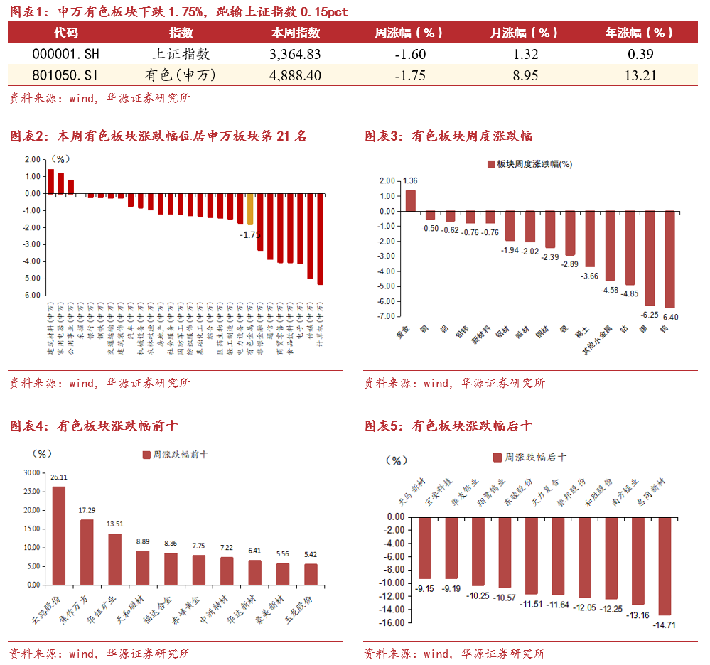 板块表现方面:本周上证指数下跌1.60%,申万有色板块下跌1.75%,跑输上证指数0.15pct,位居申万板块第21名。个股方面,本周涨跌幅前五的股票是:云路股份、焦作万方、华钰矿业、天和磁材、福达合金;涨跌幅后五的股票是:惠同新材、南方锰业、和胜股份、银邦股份、天力复合。