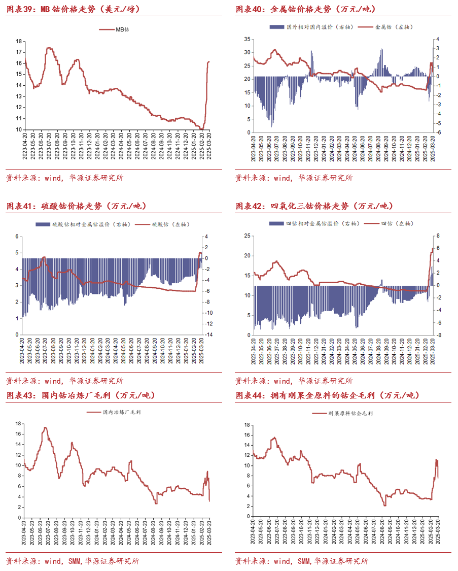 ➢铜:关税预期下,美铜溢价持续拉大。本周美铜/伦铜/沪铜分别上涨4.54%/0.73%/0.14%,关税预期下美铜溢价持续拉大。供给端,据smm,印尼政府向自由港印尼公司颁发6个月铜精矿出口许可证,自由港印尼公司表示已经从印尼贸易部获得127万吨铜精矿许可证。需求端,高铜价短期压制下游开工,库存整体去化,本周铜杆开工率69.93%,环比降低5.21pct,smm电解铜社会库存34.64万吨,环比降低2.56%,沪铜库存25.63万吨,环比提升0.34%。旺季逐步来临,铜需求端有支撑,在加工费持续低迷背景下,若冶炼厂减产现象持续扩散,铜矿端短缺或逐步向金属端传导,铜价有望迎来上行周期,另一方面重点关注美国对铜加征关税的落地情况。建议关注:紫金矿业、洛阳钼业、金诚信、铜陵有色。