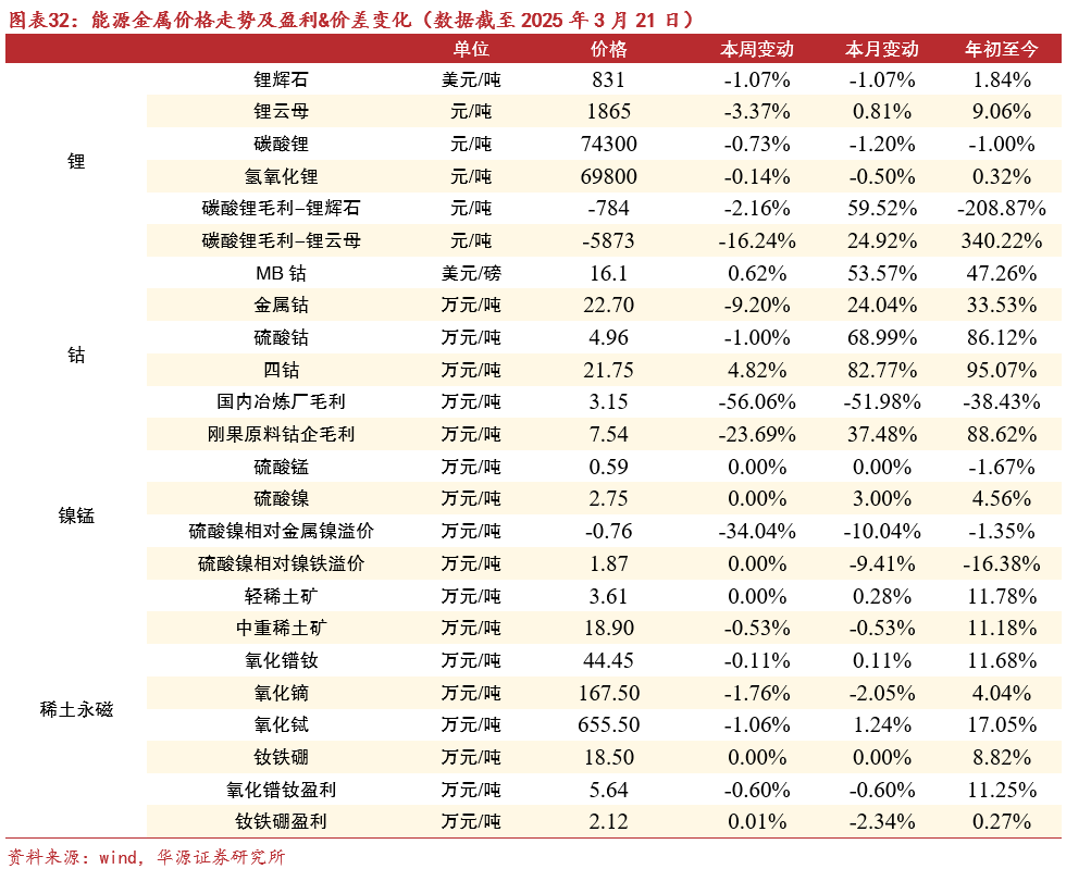➢锂:库存持续累积,过剩格局延续,锂价震荡下行。本周碳酸锂价格下跌0.73%至7.43万元/吨。供给端,碳酸锂过剩格局延续,库存持续累积。本周碳酸锂产量1.79万吨,环比降低2.5%。SMM周度库存12.64万吨,环比增长2.2%。需求端,下游接货意愿薄弱,刚需采购为主。当前需求端的增长难以覆盖供给端的超预期释放,锂价目前或处于二次探底过程中。展望全年看,供给端,伴随锂价下行,高成本锂供给持续出清,供应增速边际走弱;需求端,以旧换新政策下,电车需求或超预期,碳酸锂全年过剩幅度有望收窄,预计锂价维持7-8万元/吨震荡为主。我们建议关注具备第二增长曲线的低估值标的和仍具备锂自给率提升和降本空间标的:雅化集团(锂+民爆)、中矿资源(锂+小金属+铜)、永兴材料、赣锋锂业。