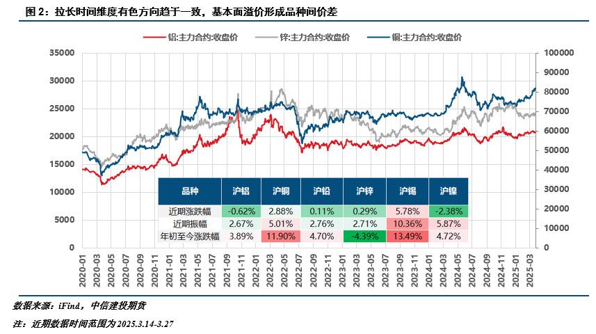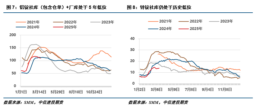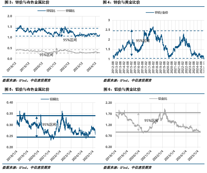 从比价角度而言,目前锌与铝相较于铜均处于相对估值低位,与黄金比价亦是如此。考虑到短中期宏观定价逻辑较为混乱,即既有多方关税带来的纽铜/铝溢价,又有空方美经济走弱甚至滞胀的担忧,单纯以一方思路去理解难免出现偏差。铝与锌相对“后排”的优势即能在此体现,可观望铜/贵金属等“前排”品种走势再行布局。
