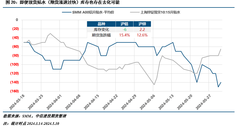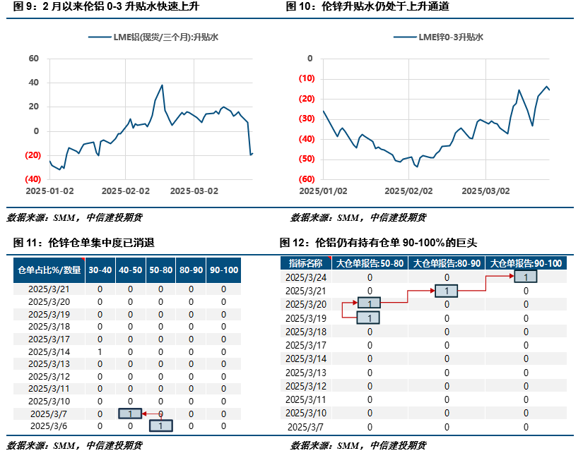 从外盘也即伦铝/锌库存来看,二者均有交割问题袭扰。铝方面,今年春节前后LME0-3升贴水便进入上升通道,从持仓及仓单集中度看,2月中下旬伦铝盘面即有单个超90%仓单持有者,且多头持仓也超过30%。据彭博社报道,其真实身份并非前几年经常抛头露面的托克和嘉能可,而是新入局的能源贸易商Vitol与Gunvor。从最新数据来看,目前仓单巨头持仓占比已由3月20日的50-80上升至3月24日的90-100,0-3升贴水已回归负区间,后续不排除该巨头通过注销仓单继续拉涨伦铝一侧的可能性。锌情况相对类似,2月中下旬伦锌盘面出现持有仓单50-80的巨头,而后0-3升贴水即进入上升周期,3月初该巨头通过注销仓单带动升贴水上行,3月10日以后仓单集中度逐步回归正常水平,后续交割扰动风险相较伦铝更小。