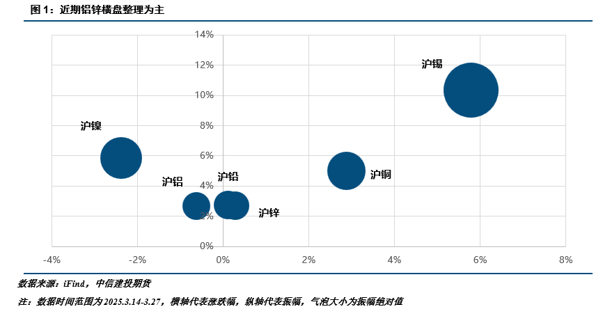 近期有色行情波动较大,其中主要以铜及锡等表现亮眼,期间沪锡一度涨停,铜涨幅更是达到了2.88%。板块内分化较为严重,镍与铅前期涨幅较快近期有所回吐,锌与铝则围绕各自23800及20800的重心横盘震荡,未能形成有效突破。