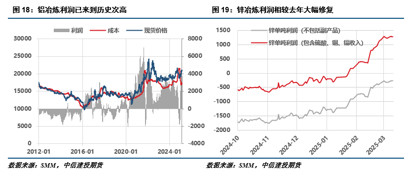 相比而言,有色里铝与锌算是为数不多的矿端暂无扰动且全年原料趋于宽松的品种。铝方面主因几内亚铝土矿产能提升+港口运输恢复,锌方面则主因海外锌矿24年Q3以来的投复产潮+国内矿山季节性减停产后恢复放量。氧化铝受宽松预期影响也一度下探成本线,给予电解铝一侧较高的冶炼利润——回溯近10年的表现,目前电解铝利润基本已达到21年以来的次高水平。锌精矿加工费近期也是节节攀升,多数冶炼厂综合副产品收入目前已实现盈利。