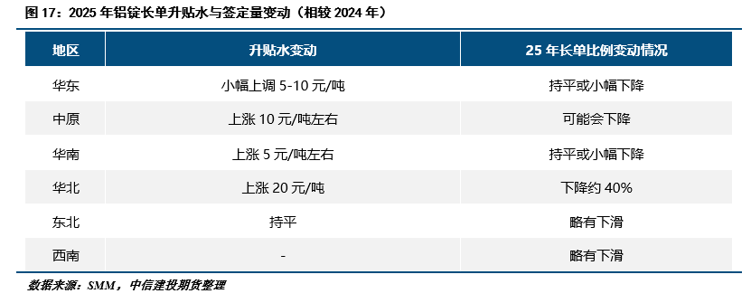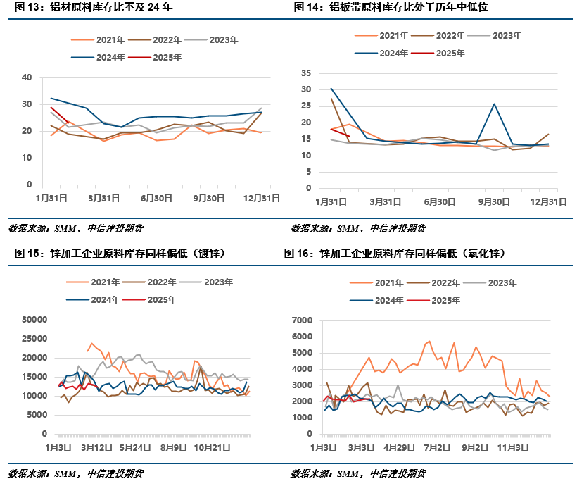铝方面,据SMM统计数据,铝型材及铝板带箔原料库存比均处于历史中低水平,相较去年明显有下滑趋势。同时据SMM去年末调研情况,25年全国铝锭长单签订量相较同期均出现不同程度下滑,其中华北地区签订量下降约40%左右,其他地区则持平或小幅下降为主。锌方面情况类似,镀锌厂原料库存同样处于近五年低位水平,虽然未找到长零单比例数据进一步佐证,但锌加工企业历来以“买涨不买跌”著称,也即行情波动较大时,畏涨的心态反而能激发下游的采买积极性。