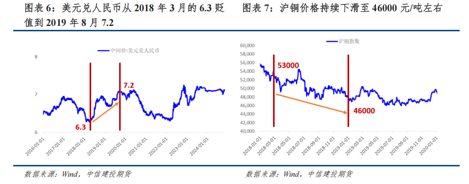 2月10日,特朗普宣布自3月12日起对全部进口的钢铁和铝征收25%的关税,引发COMEX铜价持续拉升,短期来看关税政策引发部分品种地区间供需不平衡,但长期来看利空经济。历史来看,2018年3月特朗普根据“301调查”结果,宣布计划对从中国进口的商品征收关税。从时间节点来看,美元兑人民币从2018年3月的6.3贬值到2019年8月7.2。中美贸易摩擦升温引发全球宏观经济降温,沪铜价格从2018年3月最高价53000元/吨下滑至2019年1月46000元/吨左右。