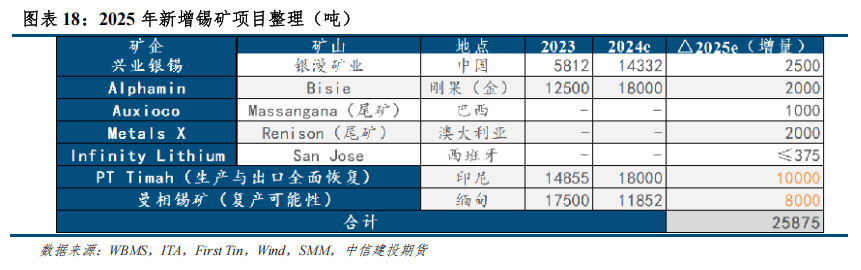 2025年原料供应量级增产(较2024年)——预计全球锡增量约1.58万吨(不纳入刚果金矿减量+缅矿不复产,刚果金减量1.3kt/月),去年约0.9万吨。