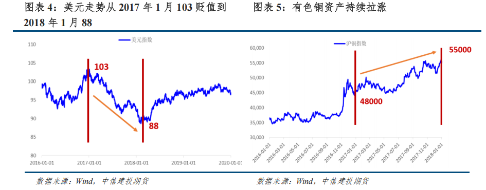 从历史来看,2017年1月美元指数从103贬值到2018年1月的88,沪铜价格从48000元/吨持续上涨至55000元/吨。1971年8月尼克松政府宣布停止美元与黄金兑换,将美元较主要货币贬值10%左右,同时对进口商品加税,铜价从1971年1150美元/吨涨至1973年1310美元/吨,涨幅超过10%。
