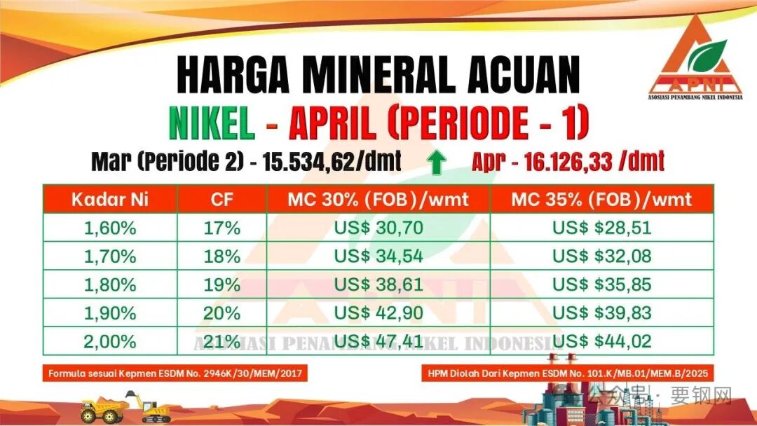 印尼镍矿工协会(APNI)公布了2025年4月第一周的镍基准价格,显示镍价较上月出现显著上涨。2025年3月期间镍价为每干吨15,534.62美元,而2025年4月期间镍价已上涨至每干吨16,126.33美元。