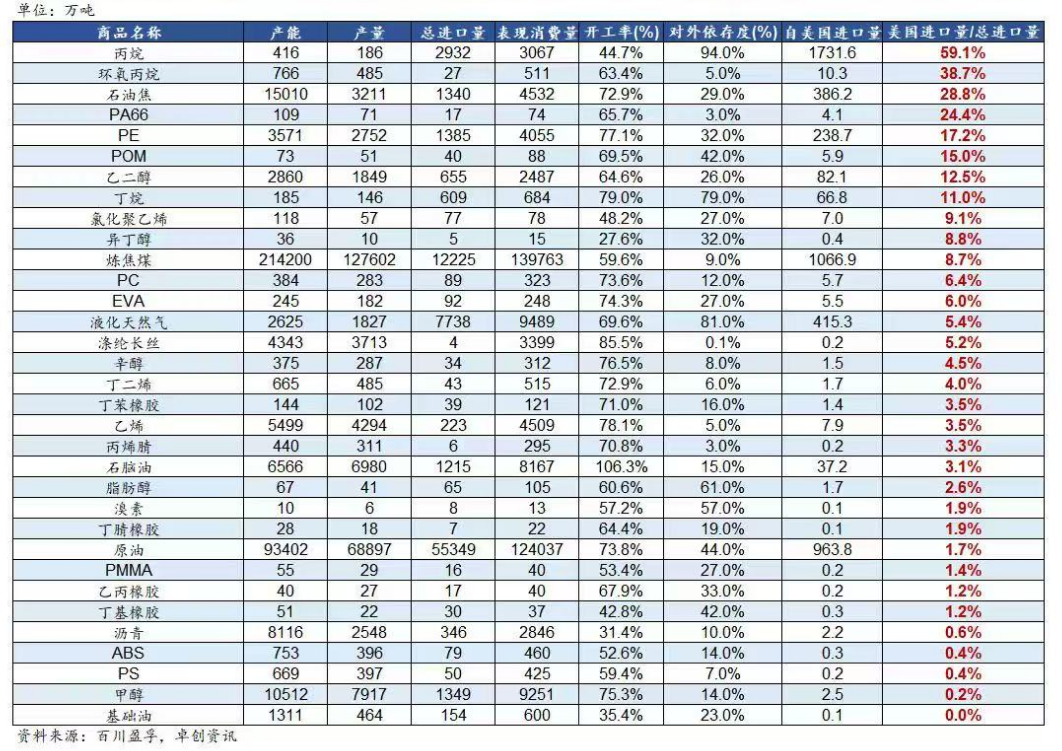 图表 能化品自美国进口占比及对外依存度等
