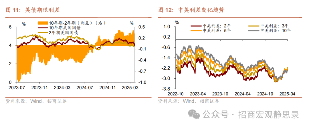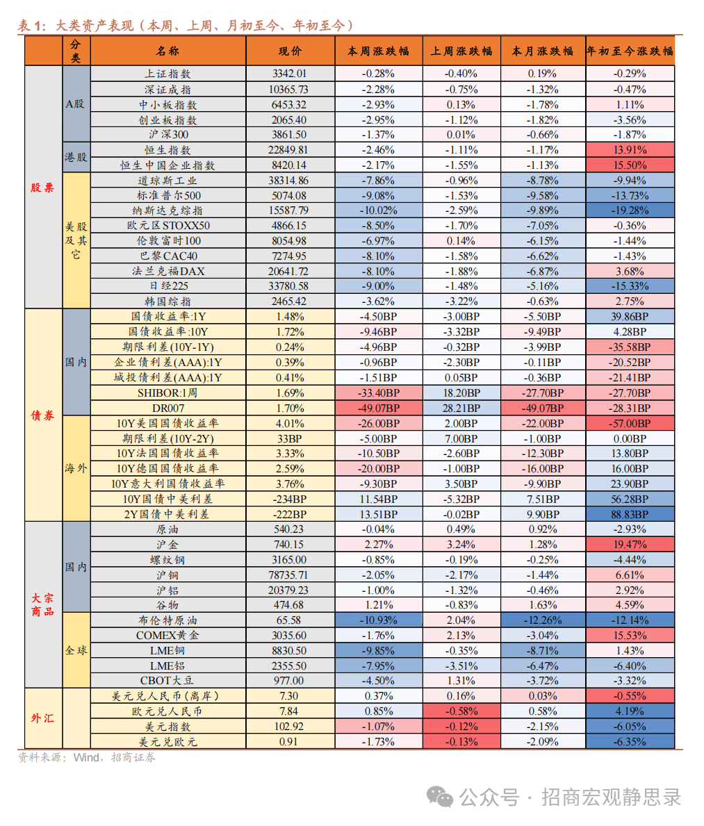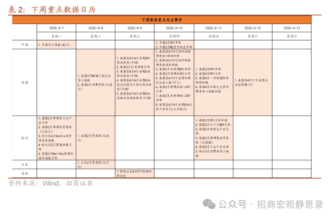 国内方面,1)本周特朗普对等关税方案正式宣布,对中国直接出口和间接出口的加征关税幅度均大幅超出此前预期,预计在关税正式生效之后,4月起出口下行压力将显著放大。正如我们在4月3日的报告《关税靴子落地,出口行业影响面面观》中的测算结果,在年内给定平均额外加征税率为54%的情况下,预计2025全年中国出口增速降至[-6%,-5%]区间。行业层面,本轮关税对石油石化、建筑材料、国防军工影响或偏小,医药生物、电子、通信、计算机的影响或偏大。此外,纺织轻工出海企业或因东盟关税而受冲击。2)关税落地后可重点关注“转出口”的形势变化,当前阶段内需仍有待进一步回升,中国出口商品向非美地区转移对于短期内稳定生产增速、缓解产能和价格压力仍有重要意义。3)考虑到春节后经济回升斜率偏缓、内需改善幅度有限,即使短期内存量政策加快落地节奏,大概率仍难以对冲关税影响。但从4月4日中方果断出台对等政策来看,国内政策端或在特朗普上台前后就对各类可能发生的情形有了明确预案,关注4月底政治局会议释放的增量信息。此外,预计4月份央行降准的概率将明显上升。4)从资产端表现来看,近期利率债与红利板块或相对受益,若后续政策预期升温,亦可对内需链相关板块进行逢低布局。