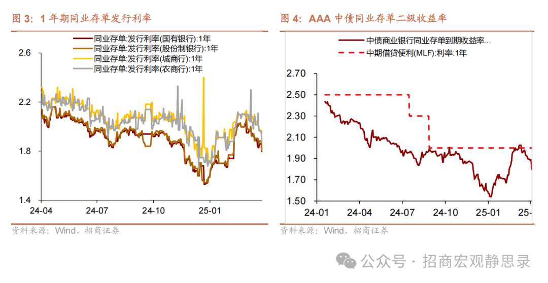 存单收益率整体下行,主体利差收窄。一级市场上,1M、3M、6M周均发行利率分别下行9.51BP、7.45BP、2.70BP至1.94%、1.93%、2.01%。二级市场上,1M、3M、6M、9M、1Y 存单收益率周均值分别下行14.8BP、4.3BP、4.5BP、4.4BP、4.5BP 至 1.82%、1.85%、1.86%、1.87%、1.86%;各等级存单收益率下行,AAA、AA+、AA 等级 1 年期存单收益率分别下行4.5BP、4.7BP、4.5BP 至 1.86%、1.91%、2.00%。
