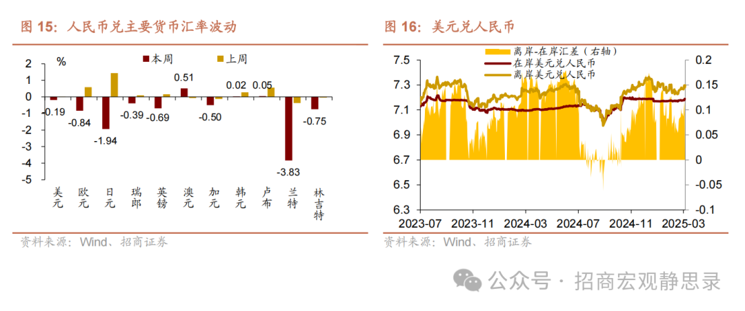 本周,美元指数大幅走低,人民币兑美元汇率贬值。以周均值计,人民币中间价较上周贬值0.06%至7.181,即期汇率贬值0.17%至7.2741,离岸人民币贬值0.21%至7.2841。