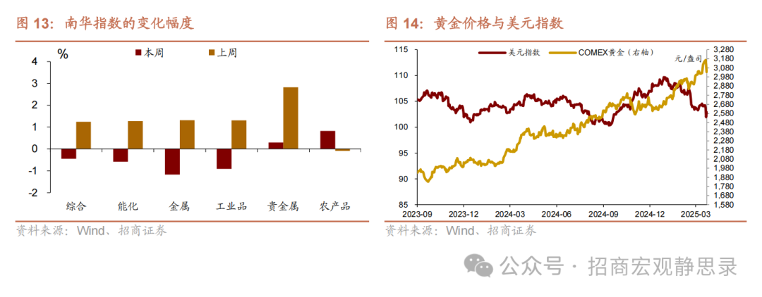海外方面,1)特朗普对等关税方案大超市场预期,欧洲、加墨、南美受影响相对较小,亚非地区加征高额税率,本质或是基于制造竞争力实施梯队关税。中国出台对等政策后需要警惕“极端情形”出现的可能性。2)行政令显示总统随时有权限调整,说明对部分国家来说存在谈判空间,关注4月9日之前美国与部分国家的谈判情况。3)在特朗普关税政策的冲击之下,全球风险偏好显著回落,4月6日当周美国、欧洲、亚太地区权益市场普遍出现大幅下跌,且标普500和纳斯达克指数周跌幅高于欧洲和亚洲市场。4)我们在报告《美股调整到位了吗?》中指出,一般经济放缓等情形下,标普500指数会有20%左右的调整,随后美联储政策有望转向并对冲美股下行风险。我们此前一直强调Q2美国在落地关税政策后会转向减税等积极内政。因此,下周美股走势非常关键,如果,美联储转鸽或者释放内政积极信号,标普止跌企稳为大概率。但,美股反弹中要关注三大股指的相对表现,若纳斯达克未能再创新高,则反弹后美股或仍有巨大下行风险。