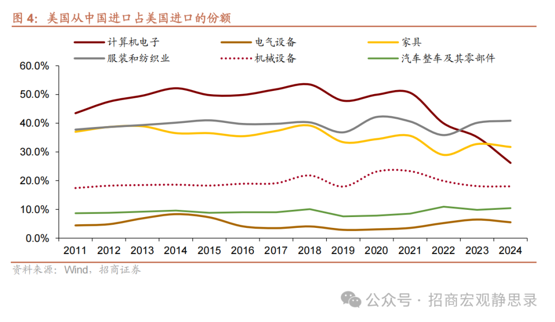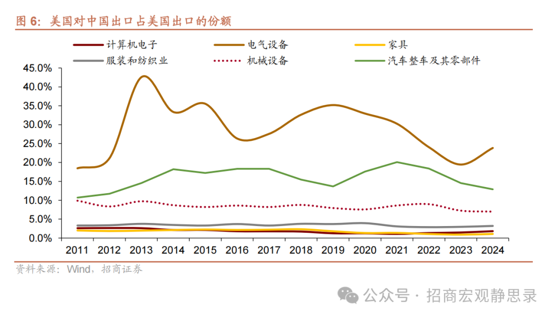 从主要制造业类别看,中国家具、计算机电子、服装和纺织业、机械设备和汽车整车及其零部件的出口对美国市场的依赖度均超过10%,这些行业受到关税冲击较为明显。从美国角度看,美国从中国进口占比较大的行业分别为计算机电子、服装和纺织业、家具,这三大类从中国进口占比均超过25%。从双方依赖度来看,以上几类商品的关税或有进一步磋商谈判的空间。
