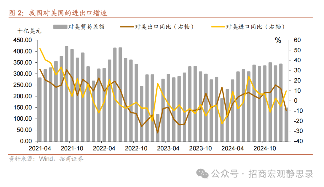 此次中国对美加征关税对中国进口增速拖累或略超0.5个百分点。关税提高直接推高进口商品价格,抑制进口需求。根据世界贸易组织(WTO)标准模型,中国对美进口价格弹性系数约为-0.24(即关税每提高1%,进口量下降0.24%),中国从美国的进口额占中国总进口额的比重约为6.3%,简单计算此次对美加征关税对我国进口增速拖累略超0.5百分点。