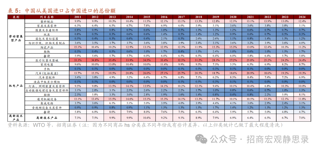 从主要制造业类别看,中国汽车整车及其零部件、机械设备进口对美国市场的依赖度均超过10%,这些行业受到关税冲击较为明显。从美国角度看,美国对中国出口占比较大的行业分别为电器设备、汽车整车及其零部件、机械设备,这三大类对中国出口的占比均超过5%。从双方依赖度来看,以上几类商品的关税亦或有进一步磋商谈判的空间。