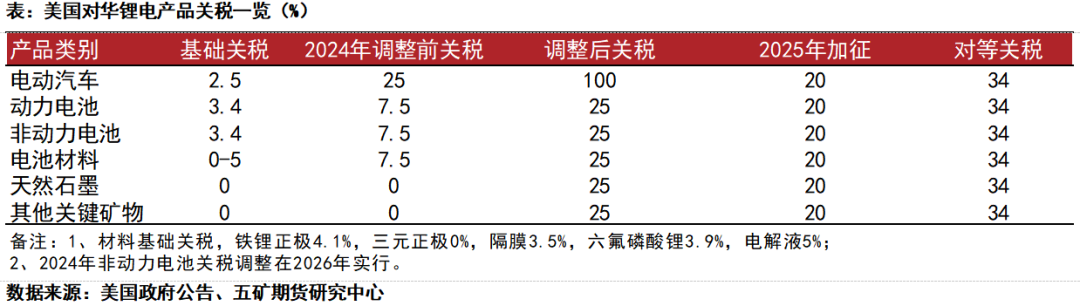 特朗普2025年4月3日签署两项“对等关税”行政令,宣布美国对贸易伙伴设立10%的“最低基准关税”,并对某些贸易伙伴征收更高关税。该政策公布后,全球权益市场和商品市场承压。若“对等关税”严格执行美国国内锂离子电池、锂电主材和关键矿物成本将大幅上升,从而抑制美国美国电动汽车和锂电储能需求。叠加特朗普政府早前取消绿色能源转型补贴,美国锂电终端消费不容乐观。