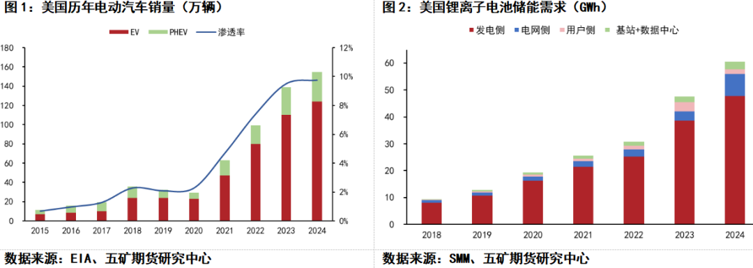 2021年开始,拜登政府采取一系列与电动汽车和可再生能源相关的政策和举措,推动交通工具电动化及绿色能源配套,美国锂电产业进入高速发展期。2024年,美国全年销售电动汽车154.7万辆,同比2023年增长11.3%,较2020年增长近5倍。在乘用车中,电动汽车总体渗透率约9.7%,而2020年约为2.3%。2024年美国锂离子电池储能市场需求约为60GWh,年增长率为27%,较2020年增长约3倍。