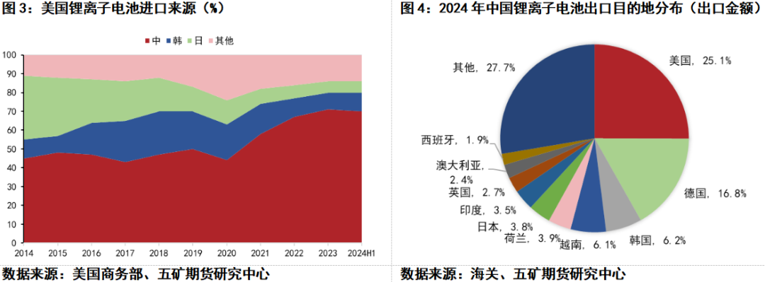 同时,美国也是中国目前锂电池出口的主要地区之一。据海关数据,2024年,中国锂离子电池累计出口数量39.14亿个,同比增长8.1%,累计出口额为611.21亿美元,出口目的地前五位分别为美国、德国、韩国、越南和荷兰。其中,中国出口到美国的锂离子电池总金额约153.15亿美元,占出口额总量的25%。自2020年以来,美国连续五年成为中国锂电池最大出口目的地。