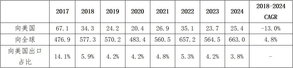 中国向美国出口的大多数铝材产品已遭遇双反制裁,且税率极高,对美出口量因此显著下降。2018年以来,中国向美国出口未锻轧铝(HS7601)及铝材(HS7603-7608)降至20-35万吨规模,2024年仅出口25.4万吨,较2017年下降62%。但中国向全球出口总体保持增长,2018-2024年年复合增长率为4.8%,对美国的出口在中国总出口量中占比大幅缩减,2024年仅为3.8%,较2017年下降10.2个百分点,美国已从中国最大的铝材出口目的国退至第六位。