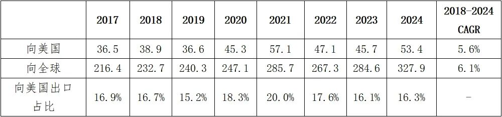 近年来,中国向美国出口铝制品(HS7609-7616)规模总体稳定,维持在35-60万吨规模,约占中国总出口的16%,2018-2024年年复合增长率为5.6%,低于向全球出口的平均增速。