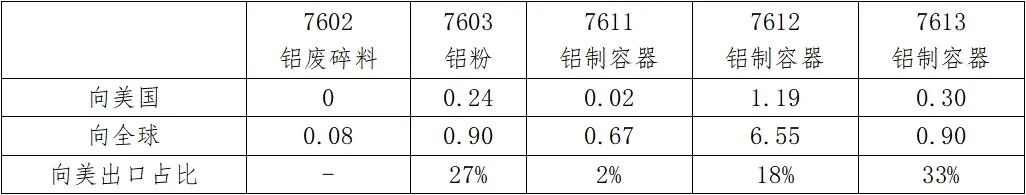 由于此前“232”已对铝及铝合金(7601),绝大多数铝材产品(7604-7608),大部分铝制品和铝部件(包括7609项下铝制管子附件,7610项下铝制结构体,7614项下铝制绞线、电缆,7615项下大部分餐桌、厨房及家用铝制器具,7616项下部分铝制品,8708项下铝制车轮等)进行了制裁,本次主要涉及废铝(7602)、铝粉(7603)及铝制容器(7611-7613)。