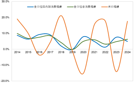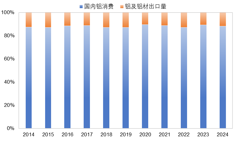 长期以来,中国铝消费以满足国内需求为主,铝及铝材出口占比维持在10%左右的水平。根据安泰科数据,2024年中国全口径国内消费为5023万吨,占总消费的88%,2015-2024年年复合增长率为5.3%;铝及铝材出口量663万吨,占总消费的12%,2015-2024年年复合增长率为4.4%。整体来看,由于出口市场充满不确定因素的挑战,中国铝及铝材出口波动较大,而国内市场不仅具有规模基础,且仍具一定增长潜力,因此,国内消费是拉动中国铝消费增长的绝对力量,巨大的国内市场是支撑中国铝工业可持续发展的根基。