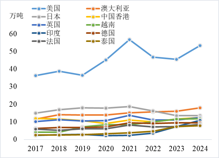 2017年美国发起贸易战以后,全球供应链格局重塑。中国向美国出口显著下滑,欧盟、东南亚、日韩等国家或地区向美国出口不断增长。与此同时,这些国家或地区也增加了从中国进口产品满足本国消费的需求,这种递推式的出口格局在全球形成了新的贸易平衡。2024年中国铝材出口至220个国家和地区,向前十名国家共计出口332.1万吨,占总出口量的53.0%;墨西哥是最大的出口目的地,占比10.0%,其次是越南(6.5%)、韩国(6.2%)、泰国(5.6%)、印度(5.6%)、美国(4.0%)、加拿大(4.0%)、印度尼西亚(3.9%)。铝制品出口至231个国家和地区,其中,美国一直是铝制品最大出口目的国(16.3%),其次是澳大利亚(5.5%)、日本(4.1%)、中国香港(3.8%)、英国(3.8%)、越南(3.6%)、印度(3.3%)、德国(2.9%)、法国(2.6%)、泰国(2.4%),前十位国家和地区共计158.5万吨,占比48.3%。