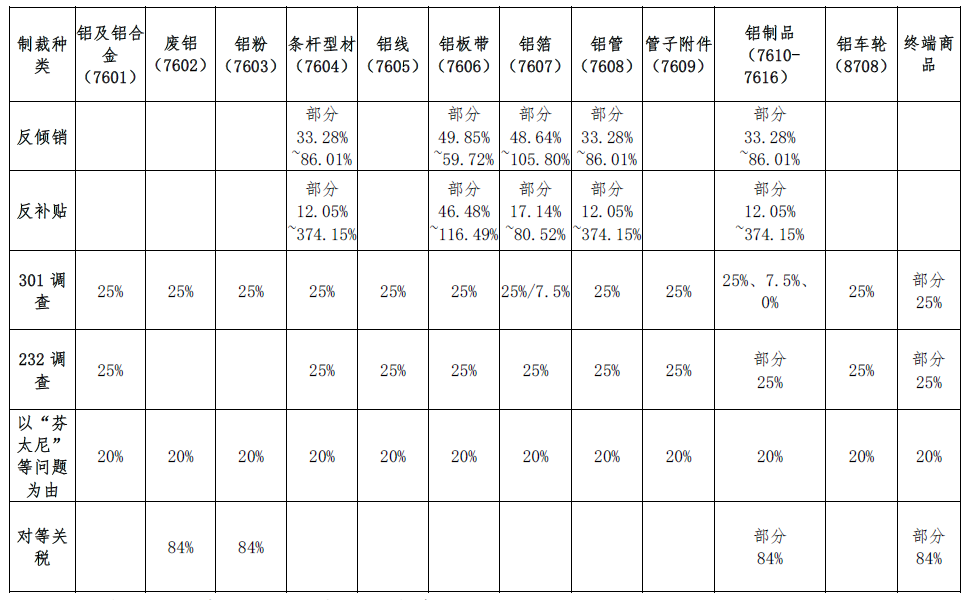 美国是向中国铝产品发起贸易制裁最多的国家。2017年以来,美国以各种理由对自中国进口的铝及相关商品密集发起贸易制裁,并不断升级,其中影响较大的包括反倾销和反补贴、“232”、“301”、“涉疆法案”等。今年以来,美国政府已将“301”关税由此前的10%提高至25%,将“232”关税由此前的10%提高至25%,以“芬太尼”等问题为由加征20%关税。多重制裁关税叠加实施,税率最高超过500%。