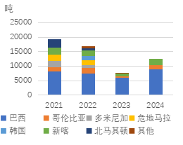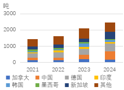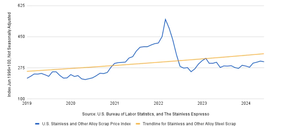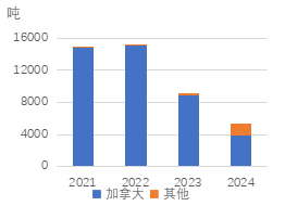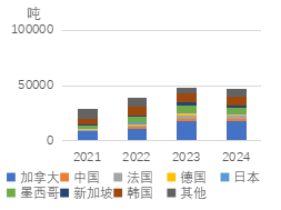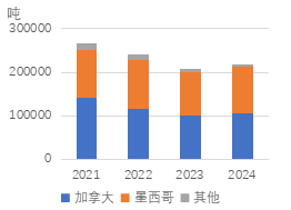根据美国国际贸易委员会数据,2024年美国进口废不锈钢21.8万吨,较2023年低位水平有所回升,加拿大和墨西哥是最主要的进口来源。一方面,通货膨胀使消费承压,不锈钢产量随之下行;另一方面,废不锈钢供应减少、价格走高,在一定程度上抑制废不锈钢进口。