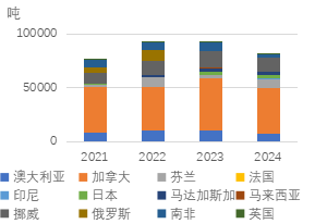 根据美国国际贸易委员会数据,2024年美国镍铁进口12514吨,主要来自巴西、哥伦比亚和新喀里多尼亚,其中巴西是美国最主要的镍铁进口来源。2024年美国电镍进口81754吨,主要来自加拿大、挪威、芬兰、澳大利亚等主要海外电镍生产国,加拿大是最主要的来源。2024年美国进口镍粉3642吨,其中加拿大是最主要的来源。